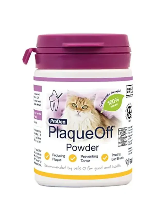 ProDen PlaqueOff®, plak birikimini, tartar oluşumunu azaltmak ve ağız kokusunu iyileştirmek için klinik deneylerde gösterilen, seçilmiş doğal deniz yosunu içeren patentli bir yem takviyesidir.