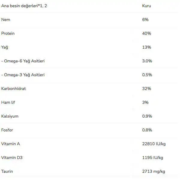 Ham protein % 40,00, ham yağ % 13,00, ham lif % 4,50, su % 9,00, ham kül % 7,00, omega 3 % 0,50, omega 6 % 3,0, vitamin A 35.000 IU, vitamin D3 1140 IU, vitamin E 1480 mg, vitamin C 140 mg, demir 60 mg, bakır 48 mg, çinko 405 mg, manganez 15 mg, selenyum 0,12 mg.