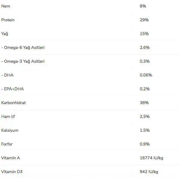 İçindekiler :Tavuk Eti, Pirinç, Mısır, Glüten Unu, Kümes Hayvanı Ürünleri, Mısır, Buğday, Karışık Tokoferollerle Korunmuş Hayvansal Yağlar, Balık Unu, Kalsiyum Fostat, Yumurta Ürünü, Balık Yağı, Tuz, Potasyum Klorür, Potasyum Sitrat, L-Lizin, Çinko Sülfat, Vitamin E Takviyesi, Vitamin A Takviyesi, Kalsiyum Karbonat, Vitamin B-12 Takviyesi, Folik Asit, Biotin, Sodyum Selenit