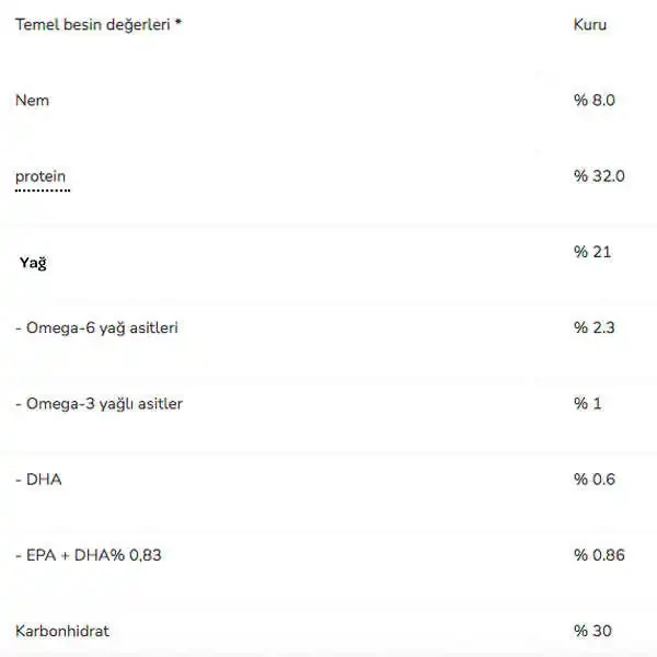 Ham protein (en az): %27, Ham yağ (en az - en çok): 15.8% - 24.6 %, Ham selüloz(en çok): 5.4%, Su (en çok): 10%, Ham kül(en çok): 7.7%, Kalsiyum (en az - en çok): 0.8% - 1.4%, Fosfor(en az - -en çok):0.6% - 1.2%, Sodyum(en az - en çok): 0.35% - 0.6%, A Vitamini(en az):15000IU/kg, D3 Vitamini(en az):750 IU/kg, E Vitamini(en az): 500mg/kg