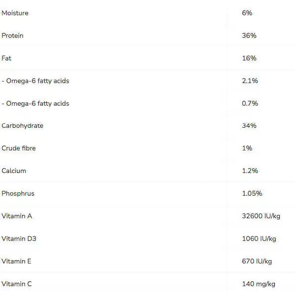 Somon (%18), kanatlı protein tozu, buğday, pirinç, mısır gluteni, buğday gluteni, hayvansal yağ, yumurta tozu, mısır, mineraller, kurutulmuş hindiba kökü, lif, aroma verici yem katkı maddesi, maya, koruyucular, amino asitler, balık yağı, vitaminler.