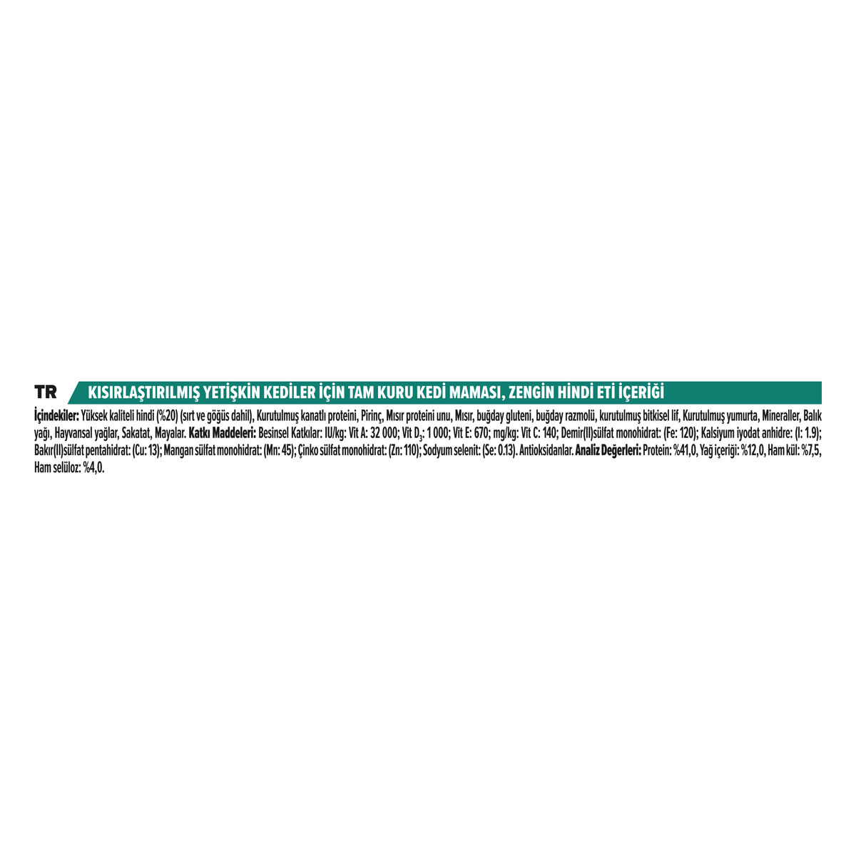 İçerik : Hindi eti, mısır gluteni,pirinç,kurutulmuş hayvansal protein(tavuk kümes hayvanları),mısır, bezelye proteini konsantresi, selüloz,yulaf lifi,buğday gluteni,mineraller ve vitaminler, yumurta, sakatat, balık yağı, hayvansal yağ, maya, tuz, bakır sülfat, çinko sülfat, selenyum, beta karoten, tokoferolce zengin ekstrakt.
