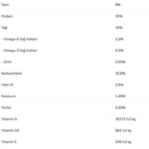 Ürün Analizi : Ham protein % 30,00, ham yağ % 19,00, ham selüloz % 2,00, ham kül % 7,50, DHA % 0,06, vitamin A 33.600 IU/kg, vitamin D3 1090 IU/kg, vitamin E 620 mg/kg, vitamin C 140 mg/kg, demir sülfat monohidrat 210 mg/kg, kalsiyum iyodat 3,40 mg/kg, bakır sülfat pentahidrat 50 mg/kg, mangan sülfat monohidrat 50 mg/kg, çinko sülfat monohidrat 450 mg/kg, sodyum selenit 0,32 mg/kg.