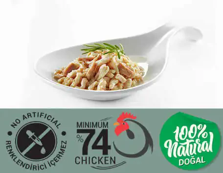 Tavuk (%74.28), Ton Balığı (%2.86), Pirinç (%1.43) ve Tavuk Suyu.