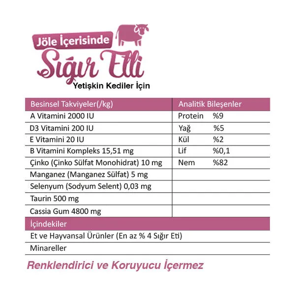 Sığır eti ile hazırlanan bu mama, yüksek protein ve dengeli yağ oranı ile yetişkin kedilerin enerji ihtiyaçlarını karşılar. Renklendirici ve koruyucu madde içermez, doğal ve sağlıklı bir beslenme sunar.