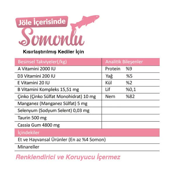 Somon parçaları ile hazırlanan bu mama, dengeli protein ve yağ oranı ile kısırlaştırılmış kedilerin enerji ihtiyaçlarını karşılar. Renklendirici ve koruyucu madde içermez, doğal ve sağlıklı bir beslenme sunar.