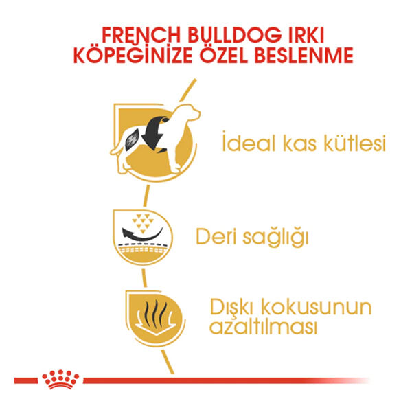 Royal Canin Fransız Bulldog Yetişkin Kuru Köpek Maması, 12 aylıktan büyük safkan Fransız Bulldog ırkı köpeklerin özel ihtiyaçları göz önünde bulundurularak geliştirilmiş eksiksiz ve dengeli bir besindir. Kas yapısını destekleyen protein oranı, deri bariyerini güçlendiren besin öğeleri ve sindirimi kolaylaştıran formülü sayesinde yetişkin köpeğinizin günlük sağlığını destekler. Brakiosefalik çene yapısına uygun özel mama tanesi ise kolay kavrama ve çiğneme avantajı sunar.