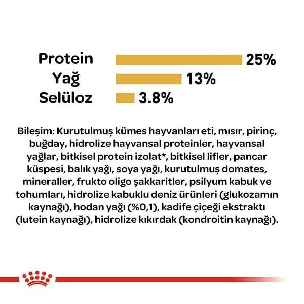 İçerik:kurutulmuş kümes hayvanları proteinleri, mısır, pirinç, buğday, hidrolize hayvansal proteinler, hayvansal yağlar, bitkisel protein izolat*, bitkisel lifler, pancar küspesi, balık yağı, soya yağı, dehidre domates, mineraller, frukto-oligo-sakkaritler, fsilyum kabuğu ve tohumları, hidrolize edilmiş kabuklu hayvanlar (glukozamin kaynağı), hodan yağı (%0,1), kadife çiçeği özü (lutein kaynağı), hidrolize edilmiş kıkırdak (kondroitin kaynağı).