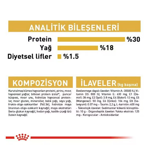 Kurutulmuş kümes hayvanları proteinleri, pirinç, mısır, hayvansal yağlar, bitkisel protein izolat*, pancar küspesi, mısır unu, hidrolize hayvansal proteinler, mısır gluten, mineraller, balık yağı, soya yağı, frukto-oligo-sakkaritler (%0,34), hidrolize maya (mannan-oligo-sakkarit kaynağı), maya ekstraktları (beta-glukan kaynağı), hodan yağı, kadife çiçeği özü (lutein kaynağı).