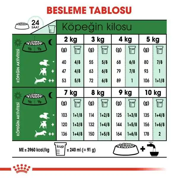 Uygun bir kalori içeriği (4060 Kcal/kg) ve protein seviyesi(%27) ile küçük köpeklerin enerji ihtiyaçlarını karşılar.