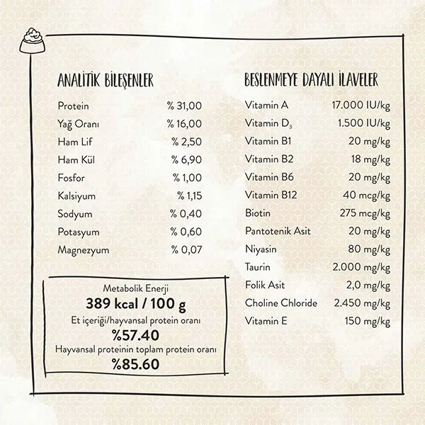 Zengin vitamin ve mineral içeriğiyle kedinizin bağışıklık sistemini güçlendirir. İçerdiği glukozamin ve doğal midye ekstresi eklem ve kıkırdak sağlığını desteklerken, omega yağ asitleri parlak tüyler ve sağlıklı bir deri için fayda sağlar. Büyük oranda et içeriğiyle kedinizin doğasına uygun, dengeli ve lezzetli bir beslenme sunar.