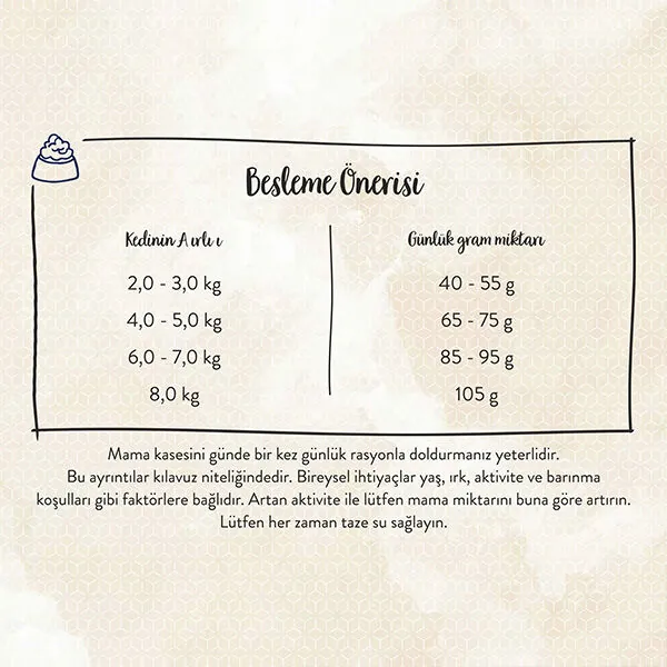 Sanabelle Glutensiz Deve Kuşu Etli Kedi Maması, kedinizin yaşına, kilosuna ve aktivite seviyesine göre porsiyonlanmalıdır. Ortalama bir yetişkin kedi için günlük 60-80 gram mama önerilmektedir. Mama kuru olarak verilmelidir ve yanında her zaman taze su bulundurulmalıdır. Yeni mama geçişlerinde, kedinizin sindirim sisteminin uyum sağlayabilmesi için mevcut mamayla karıştırarak 7-10 gün içerisinde kademeli geçiş yapılması tavsiye edilir.