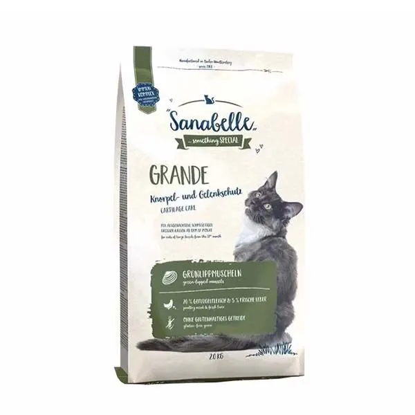 Sanabelle Grande, özellikle büyük cins yetişkin kediler için özel olarak formüle edilmiş, üstün kalitede bir mamadır. Mama tanelerinin büyüklüğü ve yapısı, kedinizin yeme hızını kontrol altında tutar ve gereksiz aşırı tüketimin önüne geçer. İçeriğindeki glukozamin ve diğer önemli yapı taşları sayesinde, eklem sağlığı ve kıkırdak gelişimi desteklenir. Ayrıca yüksek hayvansal protein oranıyla kedinizin sağlıklı kas gelişimine ve canlılığının korunmasına yardımcı olur.