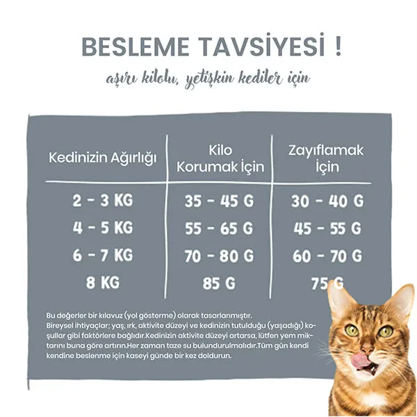 Aktivite seviyesi düşük, fazla kilolu veya kilo almaya eğilimli kediler için tasarlanan bu özel formül, eklem ve dolaşım sistemine binen yükün azalmasına yardımcı olur. Sağlıklı lif kaynakları ve kaliteli hayvansal protein içeriği ile kedinizin günlük besin ihtiyacını eksiksiz şekilde karşılar.