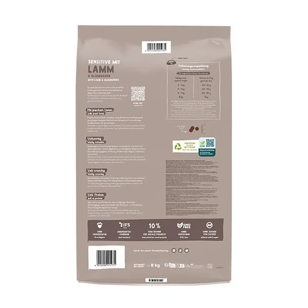 Taze kümes hayvanı eti (%20), kurutulmuş kümes hayvanları proteini, pirinç, pirinç unu, hayvansal yağ, taze kuzu (%5), taze karaciğer (%5), karaciğer unu, hidrolize protein, kurutulmuş şeker pancarı küspesi (şekeri alınmış), patates proteini, keten tohumu, bezelye lifi, somon yağı, kalsiyum karbonat, yumurta tozu, balık unu, bezelye (kurutulmuş, %0.4), kuru maya (%0,1 mannanoligo sakkaritler, %0,06 beta-glukanlar dahil), potasyum klorür, kurutulmuş kızılcık (%0,1), kurutulmuş yaban mersini (%0,1), kurutulmuş yeşil dudaklı midye, kurutulmuş kadife çiçeği, hindiba tozu, kurutulmuş yuka.