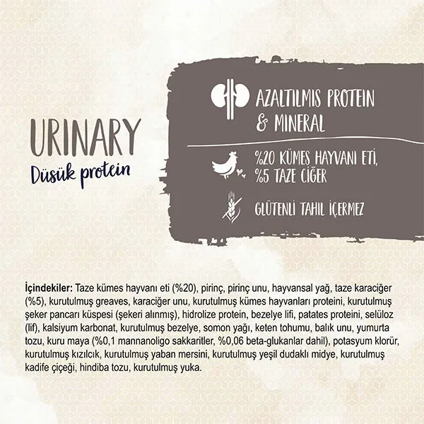 Sanabelle Uranıry kedi maması , taze kümes hayvanı(min%20) kulanılarak ve gluten içeren tahıl kullanılmadan üretilmiştir.Özellikle idrar boşaltım organları çevresinde çok hassas reaksiyon gösteren tüm yetişkin kediler için uygundur.