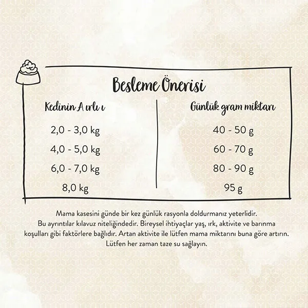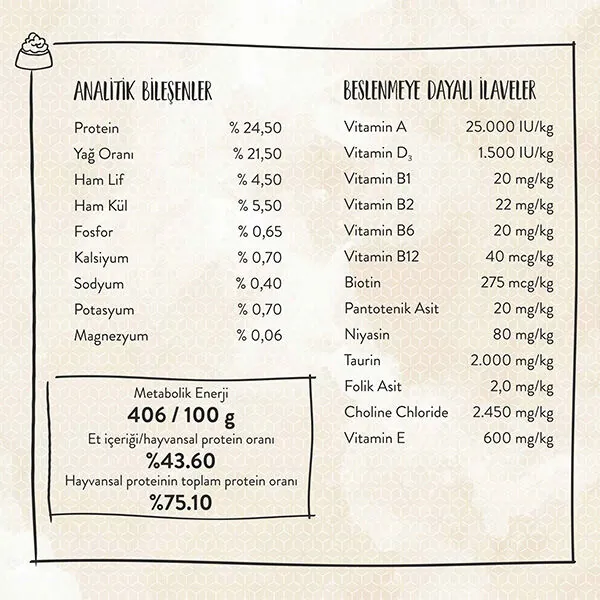 İçerik : Pirinç taze kümes hayvanı (min %20) hayvansal yağ,et unu,donyağı tortusu (kurutulmuş),karaciğer unu,protein hidrolisat,pancar posası (şekeri alınmış),selülos lifi ,keten tohumu,balık yağı,maya(kurutulmuş),yaban mersini (kurutulmuş),midye unu,hindiba tozu,kadife çiçeği (kurutulmuş),yuka özü.