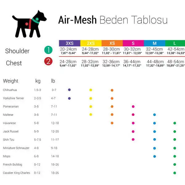 - 6 beden ve 8 renk ile mevcut 24 cm ile 60 cm göğüs çemberindeki tüm köpekler için