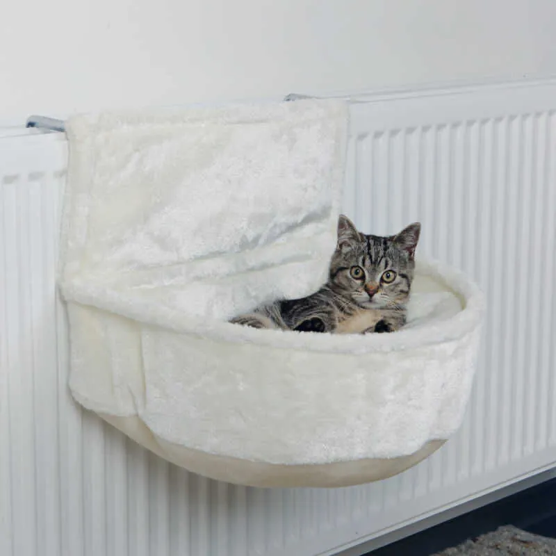 Kısa tüylü peluştan üretilmiştir. Kedi radyatör yatağının düzgün ve sağlam durmasını sağlayan sağlam metal iskelete sahip, radyatör bağlama kolları 9cm ile 12cm arası ayarlanabilir, tüm konvansiyonel radyatörler için uygun kedi kalorifer yatağıdır. İçerisinde çift taraflı kullanılabilir polyester dolgulu çok rahat yatağı vardır. 30C'de makinada yıkanabilir. Yatağın içi elde yıkanabilir. Beyaz renklidir.