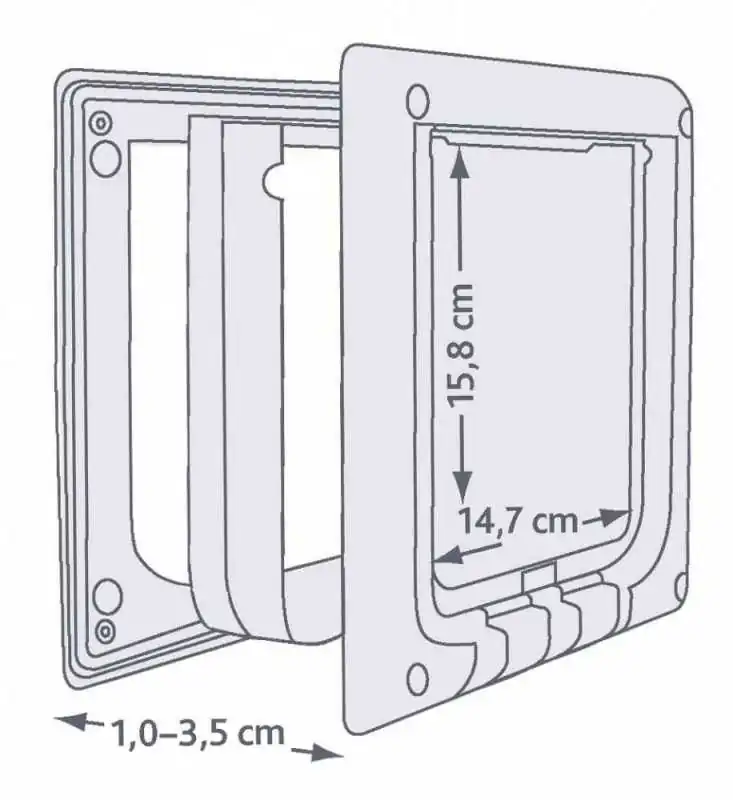 Ölçüsü 21,1 x 24,4cm dir. Kapı üzerinde kesilmesi gereken boşluk 16,5 x 21,6cm dir. Kedinin girip çıkacağı flap kapı ölçüsü 14,7 x 15,8cm dir.