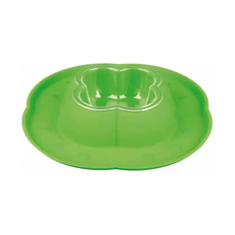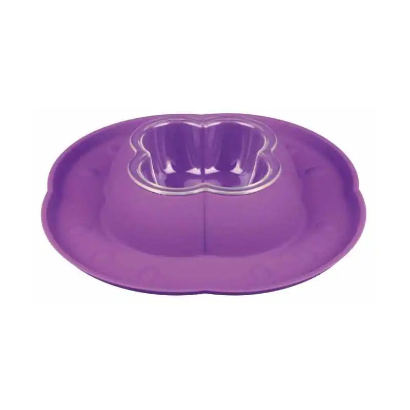 Silikon tabanlı, sıçrama önleyici, içerisinde plastik mama veya su kabı olarak kullanılabilecek kabı bulunan kedi mama ve su kabıdır