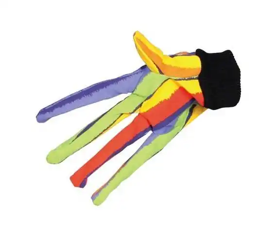 Parmakları kuvvetlendirilmiş ve uzatılmış, dört parmağına elastik iple bağlı dört adet fare olan kanvas kedi oyun eldiveni.