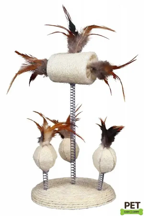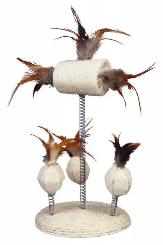 Taban çapı 15cm olan üzeri sisal kaplı parçanın üzerinde yayların ucundaki toplar ve üzerlerindeki tüylerden oluşan, kedinizin çok severek oynayacağı bir kedi oyuncağıdır. Oyuncağın üzerindeki en yüksek bölüm 30cm dir.