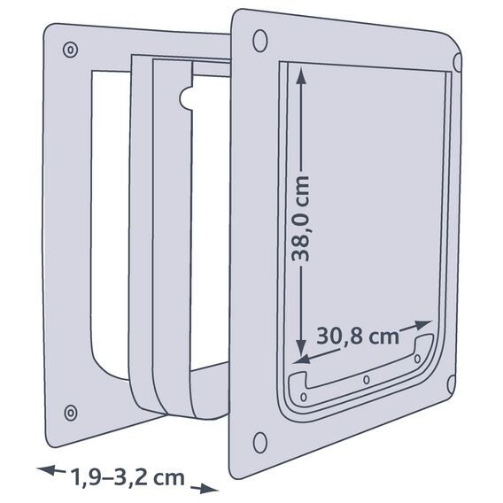 Sessiz açılıp kapanan, her mevsime uygun, özel contalı ve iki yönlü kitelenebilir, şeffaf, kolay ve çabuk monte edilebilir köpek kapısı. M-XL köpekler için uygundur. Tüm duvar ve kapı tipleri için uygundur. İç ölçüsü 33x40 cm, dış ölçüsü 39x45 cm, derinlik 19-32 mm dir. Flap kapı ölçüsü 30,88x38 cm'dir. Flap ın altında sağlam metal bar vardır.