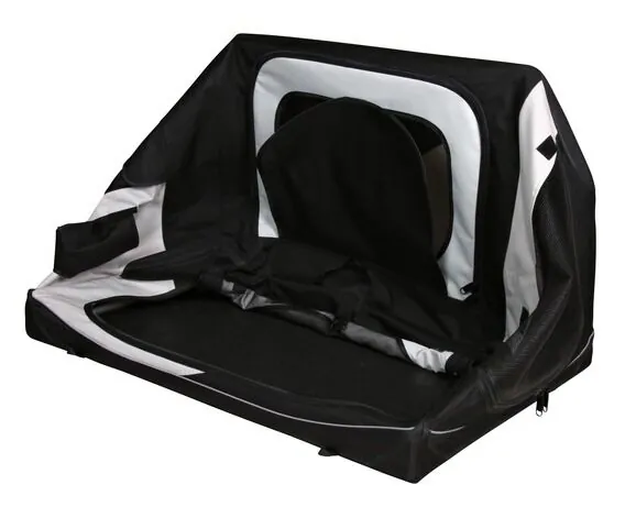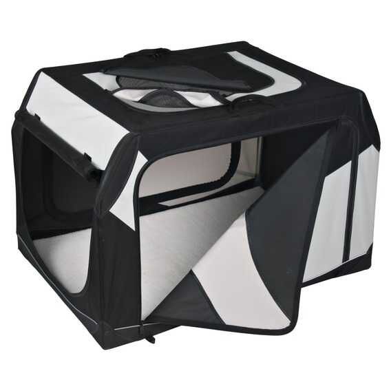 Seyahat eden, showlara veya turnuvalara katılan köpekler için uygun yüksek kaliteli naylondan imal, üç tarafı açılabilen, kaliteli ve hafif metal şasesi sayesinde dayanıklı, yanlarındaki fileler sayesinde hava sirkülasyonu iyi, kaymaz tabanlı, üst tarafındaki file peti koruma amaçlı kapatılabilen, dış mekanda da kullanılabilen, yan cepleri ve şişe cebi olan Siyah-Gri renklerde yumuşak çok fonksiyonlu taşıma kutusudur.