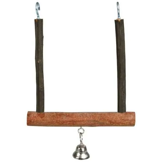Muhabbet kuşları için zilli natürel tahta salıncak.