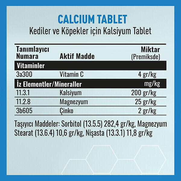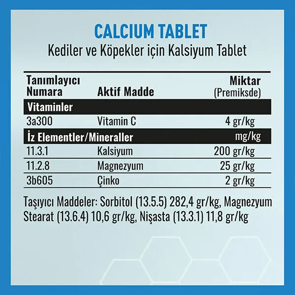 Vetcure Calcium, özellikle gelişim dönemindeki yavru hayvanlar, yaşlı bireyler veya kalsiyum ihtiyacının arttığı özel dönemlerdeki kedi ve köpekler için geliştirilmiş veteriner destekli bir mineral destek tabletidir. Yüksek oranda kalsiyum, magnezyum ve çinko ile kemik gelişimini, kas fonksiyonlarını ve diş sağlığını destekler. C vitamini ilavesiyle bağ dokularının güçlenmesine ve kalsiyum emilimine katkı sağlar.
