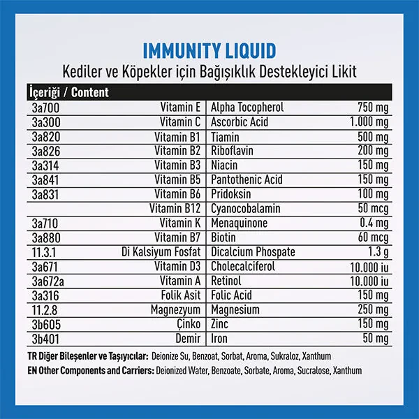 - Vitamin D3 (3a671) : 000 IU (Kalsiyum emilimi ve bağışıklık dengeleme)
