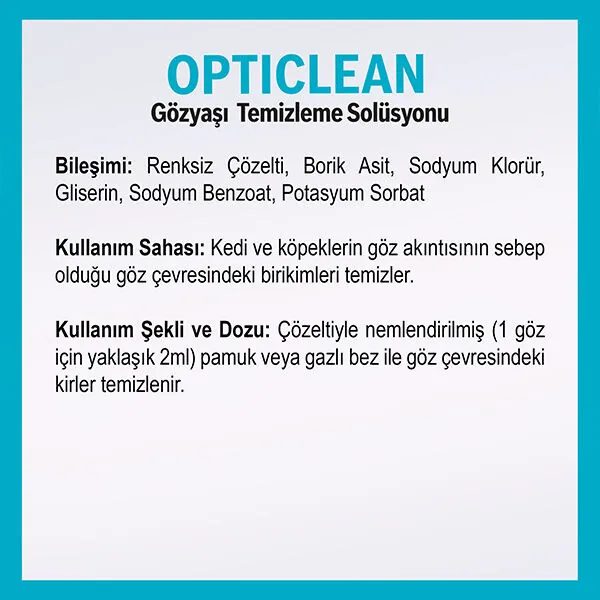 Vetcure OptiClean, kedi ve köpeklerin göz çevresinde biriken çapak, toz, akıntı ve diğer kirleticileri nazikçe temizlemek için özel olarak geliştirilmiş veteriner onaylı bir solüsyondur. pH dengeli ve renksiz yapısıyla göz çevresi için güvenlidir; düzenli kullanımda enfeksiyon riskini azaltmaya yardımcı olur ve göz hijyenini destekler.