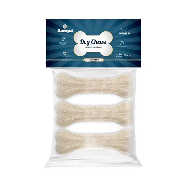 Zampa Beyaz Press Kemik, köpeğinizin çiğneme ihtiyacını karşılamak ve ağız sağlığını desteklemek için özel olarak tasarlanmış doğal bir ödül mamasıdır.
