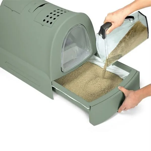 Kedi tuvaletinin çekmeceli yapısı sayesinde kum doldurma ve temizlik işlemleri oldukça pratiktir. Kedi kumunu kolayca yenileyebilir, topaklanan bölümleri zahmetsizce temizleyebilirsiniz. Bu tasarım aynı zamanda dışarıya kum dağılmasını azaltır ve yaşam alanını daha düzenli tutar.