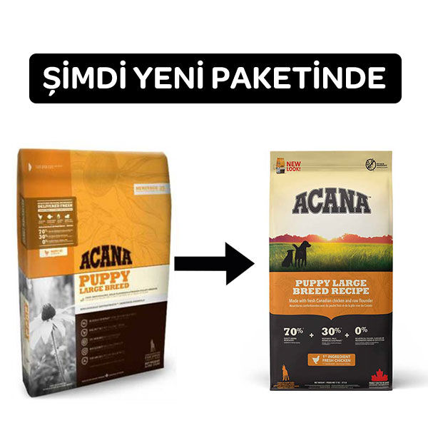 Acana büyük ırk yavru köpekler için özel olarak formüle edilmiştir.Köpeğinizin vucüt gelişiminin iyi olmasını sağlayarak, vucüt ağırlığını kontrol eder.Aynı zamanda kasların ve kemiklerinin gelişimi için et ve protein açısından oldukça zengindir.- Acana büyük ırk yavru köpek mamasında serbest dolaşan tavuk, kuluçka yumurtası ve serbest avlanan pisi balığı ile yapılmaktadır.- Pirinç, tahıl, papates gibi hızlı karbonhidratlar içermez. Bu yüzden yağsız kas oranını arttırmak ve kondisonu üst seviyede tutmak içi et proteini fazladır.- Ödüllü Kanada ürünü, taze içerikleriyle hazırlanır ve yavru köpeğinizin sağlıklı, mutlu ve güçlü tutmayı garanti etmektedir.İçerik Değerleri: Taze tavuk eti (% 16), tavuk eti (% 15), hindi eti (% 14), kırmızı mercimek, bütün yeşil bezelye,taze tavuk sakatatı (karaciğer, kalp, böbrek) (% 6), ringa balığı (% 4), taze bütün yumurta (% 4), taze bütün pisi balığı (% 4), ringa balığı yağı (% 3), güneşte kurutulmuş kaba yonca, tarla fasulyesi, yeşil mercimek, bütün sarı bezelye, bezelye lifi, tavuk yağı (% 2), taze tavuk kıkırdağı (% 2), kahverengi yosun, taze bütün kabak, taze bütün balkabağı, taze bütün yaban havucu, taze lahana, taze ıspanak, taze hardal yeşilliği, taze şalgam, taze bütün havuç, taze kırmızı lezzetli elma, taze bartlett armutu, dondurularak kurutulmuş tavuk karaciğeri, dondurularak kurutulmuş hindi karaciğeri, taze bütün kızılcık, taze bütün yaban mersini, hindiba kökü, zerdeçal, süt devedikeni, dulavratotu kök, lavanta, hatmi kökü, kuşburnu.Besinsel takviyeler: amino asit hidrat, çinko şelat : 100 mg. Zooteknik takviyeler: Enterococcus faecium NCIMB10415: 600×10^6 CFUAnaliz Değerleri: Ham protein (min.)33 %, Ham yağ (min.)15 %, Ham kül (maks.)7 %, Ham lif (maks.)6 %, Nem (maks.)12 %, Kalsiyum (min.)1.4 %, Fosfor (min.)1 %, Omega-6 fatty acids (min.)2.4 %, Omega-3 fatty acids (min.)1.2 %, DHA (min.)0.35 %, EPA (min.)0.35 %, Glukozamin (min.)1400 mg/kg, Kondroitin sülfat (min.)900 mg/kg Linoleic acid (min.)2.2 %, Carbohydrate (NFE)27 %Vitaminler: Vitamin A12 KIU/kg, Vitamin D31,200 IU/kg, Vitamin E130 IU/kg, Vitamin B1 (Tiamin)8 mg/kg, Vitamin B2 (Riboflavin)7 mg/kg, Vitamin B3 (Niasin)60 mg/kg, Vitamin B5 (Pan. Asit)20 mg/kg, Vitamin B6 (Piridoksin)2.75 mg/kg, Vitamin B120.08 mg/kg, Folik Asit1.50 mg/kg, Kolin2,200 mg/kgMineraller: Sodyum0.36 %, Klorid0.53 %, Potasyum0.75 %, Magnezyum0.13 %, Demir190 mg/kg, Çinko200 mg/kg, Bakır20 mg/kg, Manganez12.5 mg/kg, İodin1.9 mg/kg, Selenyum0.65 mg/kgAMİNO ASİTLER;Lisin2.30 %Treonin1.34 %Metionin0.69 %Isolösin1.40 %Lösin2.45 %Valin1.71 %Arjinin2.44 %Fenilalanin1.45 %Histidin0.75 %Tripitofan0.35 %Sistin0.38 %Tirosin0.98 %Metionin-Sistein1.07 %Fenilalanin-Tirosin2.43 %BOTANİK İÇERİKLER;Hindiba kökü500 mg/kgArdıç meyvası500 mg/kgMelek otu kökü350 mg/kgTatlı rezene350 mg/kgZencefil Kökü350 mg/kgNane yaprağı300 mg/kgLavanta150 mg/kg