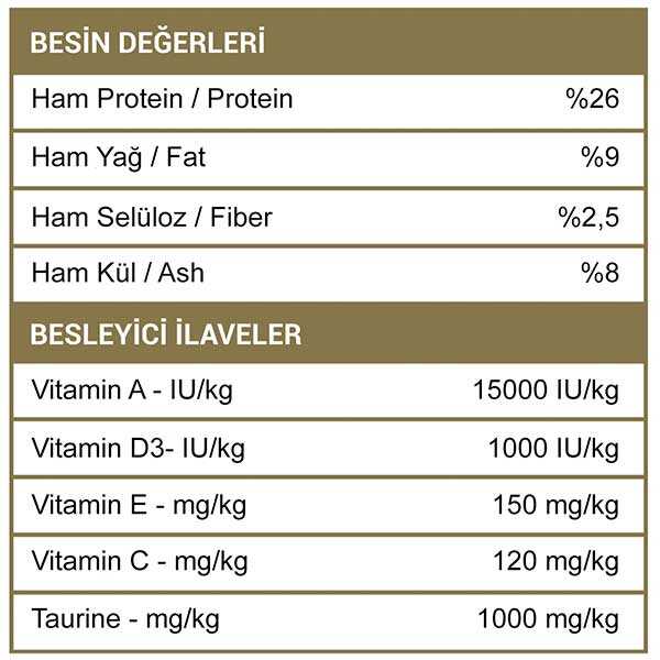İşlenmiş Hayvansal Protein (%23), Buğday (%24,08), Mısır (%20), Hayvansal Yağ (%3), Bonkalit (%8), Somon Unu (%4), Somon Yağı (%2), Mısır Gluteni (%5), Kurutulmuş Şeker Pancarı (%4), Ciğer Aroması (%3), Balık Aroması (%3), Tuz (%0.3), Keten Tohumu (%0.1), Kurutulmuş Bira Mayası (0.50), Taurin (%0.01), Koruyucular ve Antioksidanlar (%0.01 – E320 & E321)