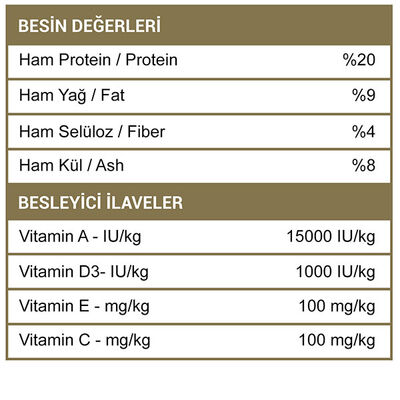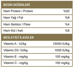 Vitamin A, D3, E ve B grubu vitaminleri; bağışıklığı desteklerken, tüy sağlığı ve enerji metabolizmasına katkı sağlar.