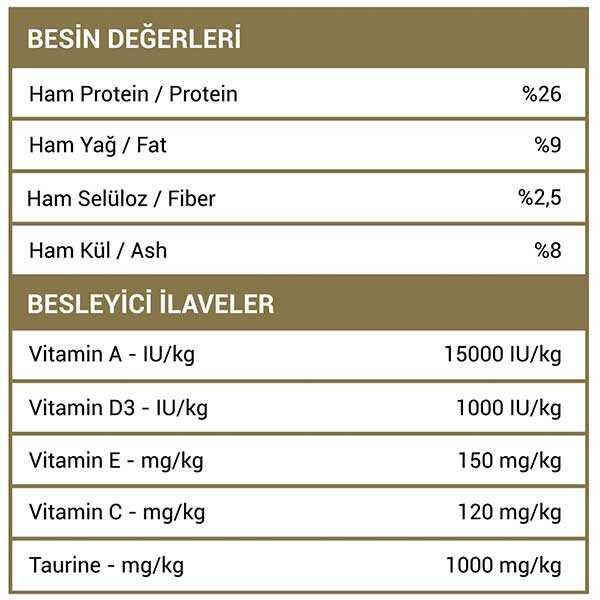 İşlenmiş Hayvansal Protein (%27), Buğday (%20), Mısır (%20), Hayvansal Yağ (%8), Bonkalit (%8.5), Mısır Gluteni (%6), Kurutulmuş Şeker Pancarı (%7), Ciğer Aroması (%2.5), Tuz (%0.4), Keten Tohumu, Kurutulmuş Bira Mayası (%0.57), Taurin (%0.01), Renklendiriciler (%0.01 – E110, E104, E102, E133, E127), Koruyucular ve Antioksidanlar (%0.01 – E320 & E321)