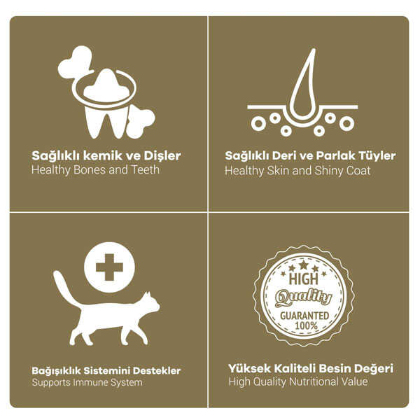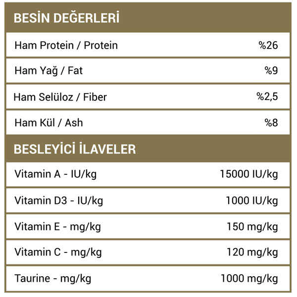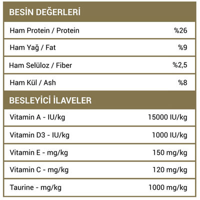 İşlenmiş Hayvansal Protein (%27), Buğday (%22), Mısır (%20), Hayvansal Yağ (%8), Bonkalit (%8), Mısır Gluteni (%6), Kurutulmuş Şeker Pancarı (%7), Ciğer Aroması (%3), Tuz (%0,3), Keten Tohumu (%0,19), Kurutulmuş Bira Mayası (%0,50), Taurin (%0,01), Koruyucular ve Antioksidanlar (%0,01 – E320 & E321).