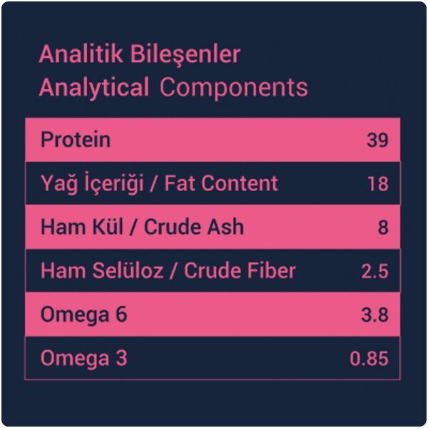 - İçeriğinde yer alan Hamsi unu, karides unu ve hamsi yağı gibi içerikler sayesinde sağlıklı deri ve parlak tüylerin oluşmasını destekler.