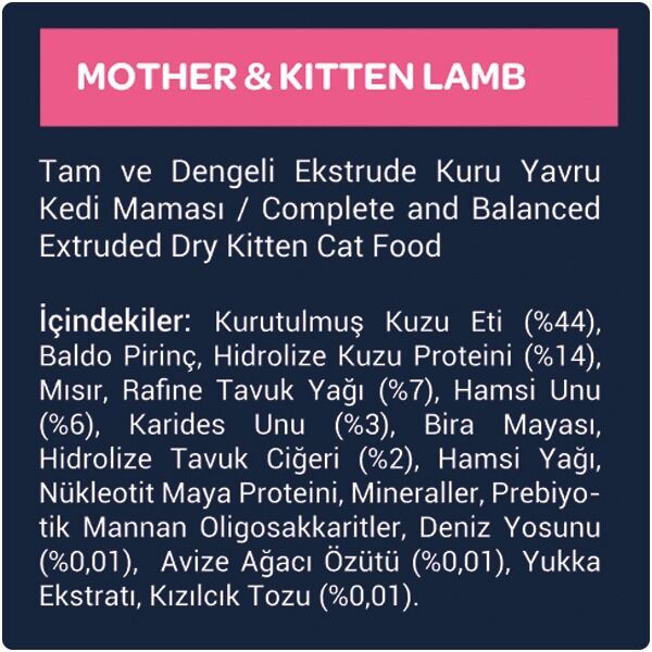 - Kurutulmuş kuzu eti (%44) ve hidrolize kuzu proteini (%14) ile zenginleştirilmiş içeriği, yavru kedinizin kas ve kemik gelişimini destekler ve enerji ihtiyacını karşılar.