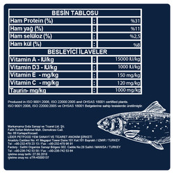 1000 mg/kg taurin, vitamin A, D3, E, C ve B grubu ile sinir sistemi, göz sağlığı ve bağışıklık sistemine kapsamlı destek sağlar.