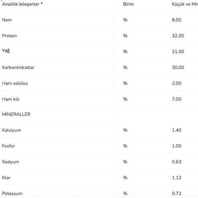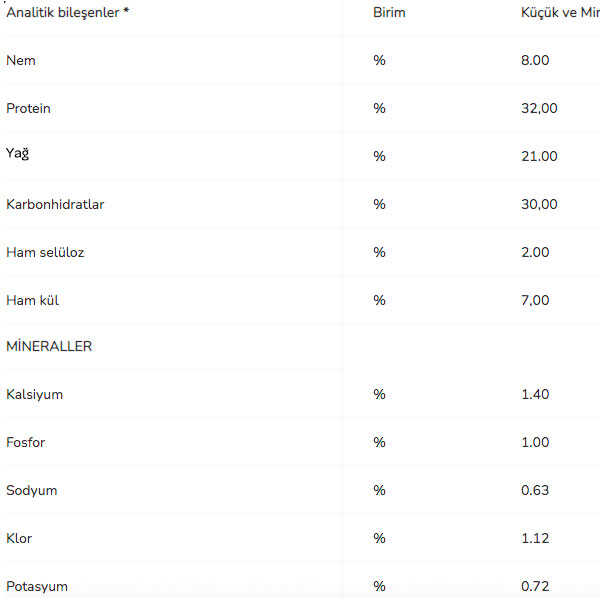 Ürün Değerleri : Protein 32,0% Yağ% 20.0, Kül% 8.0, Lif% 3.0, Calcium1.4%, Fosfor% 1.2, Omega 3 Yağ Asitleri% 0.5.