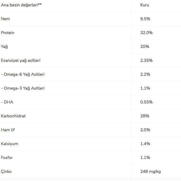 İçindekiler: Somon Balığı* (%17), kurutulmuş somon proteini*, Pirinç* (%16), Hayvansal yağ, Mısır nişastası, Mısır gluten unu*, Soya unu*,Kurutulmuş yumurta*, Kurutulmuş soya proteini*, Sakatat, Kurutulmuş pancar küspesi, Mısır, Mineraller, Selüloz, Soya fasülyesi yağı, Balık yağı. "Protein Kaynağı: KATKI MADDELERİ: Besin Katkıları: IU/kg: Vitamin A: 31.000; Vitamin D3: 1.000; Vitamin E: 550. mg/kg: Vitamin C: 140; Demir Sülfat Monohidrat: 270; Kalsiyum İyodat (Susuz): 3,5; Bakır Sülfat Pentahidrat: 54; Mangan Sülfat Monohidrat: 130; Çinko Sülfat Monohidrat: 460; Sodyum Selenit: 0,32. Teknolojik Katkı Maddeleri (mg/kg): Tokoferolce zengin ekstrakt: 55.