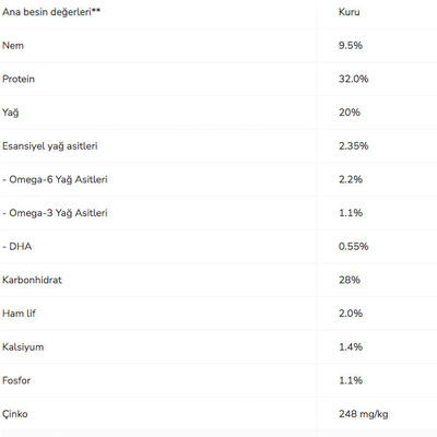 Analiz Tablosu: Protein %32, Yağ %20, Ham Kül %8, Ham Selüloz %2,5, Omega 3 Yağ Asitleri %1,2