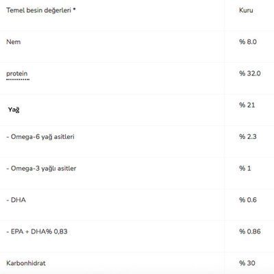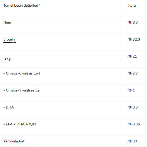 İçindekiler:Somon (% 14), Pirinç (% 14), Susuz somon proteini , Mısır glüteni unu, Mısır ezmesi, mısır nişastası, hayvansal yağ , mısır, soya unu, kurutulmuş yumurta, kuru pancar posası, mineraller, kurutulmuş hindiba kökü, balık yağı, otolizat , maya, soya fasulyesi yağı