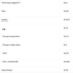 Ham protein (en az): %27, Ham yağ (en az - en çok): 15.8% - 24.6 %, Ham selüloz(en çok): 5.4%, Su (en çok): 10%, Ham kül(en çok): 7.7%, Kalsiyum (en az - en çok): 0.8% - 1.4%, Fosfor(en az - -en çok):0.6% - 1.2%, Sodyum(en az - en çok): 0.35% - 0.6%, A Vitamini(en az):15000IU/kg, D3 Vitamini(en az):750 IU/kg, E Vitamini(en az): 500mg/kg