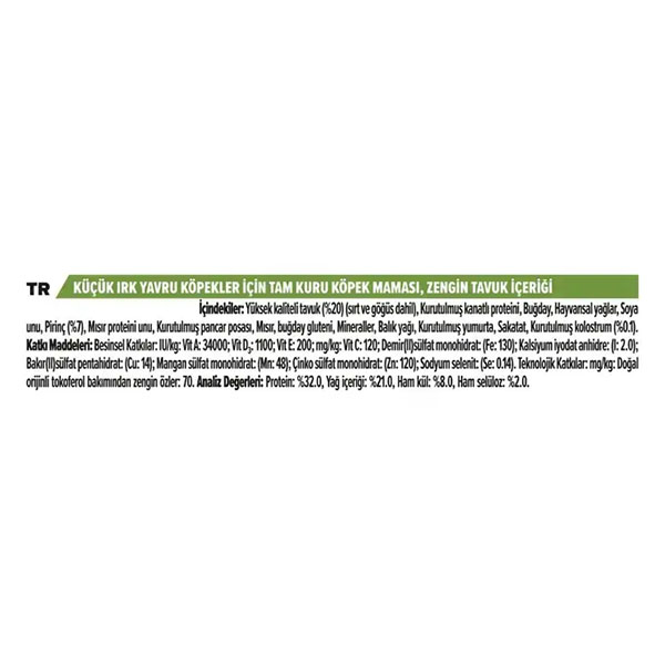 Ürün İçeriği: Tavuk Eti (% 20), buğday, mısır glüteni, kurutulmuş kümes hayvanları proteini, pirinç (% 8), hayvansal yağ, mısır, sindirmek, şeker pancarı küspesi, kurutulmuş yumurta, balık yağı, kalsiyum fosfat, potasyum klorür, sodyum klorür, mineraller, kolostrum, kalsiyum karbonat, DL-Metionin, L-Lizin.