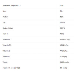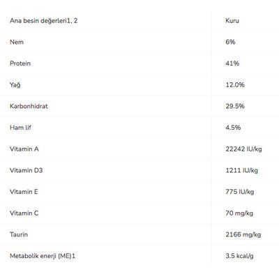 Ham Protein 37,8 En Az, Ham Yağ 9,5-14,5 En Az - En Çok, Ham Selüloz 6,5 En Çok, Ham Kül 9,5 En Çok, Su 9 En Çok, HCIde Çözünmeyen Kül 0,27 En Çok, Linoleik Asit 1,8, Kalsiyum 1,3, Fosfor 1,1, Bakır Sülfat 22 mg/kg, Taurin 1500 mg/kg En Az.